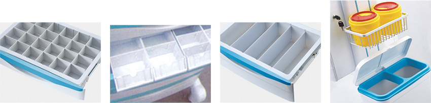 上三层为80mm高内部分隔抽屉,可放置各种分类麻醉药品等;