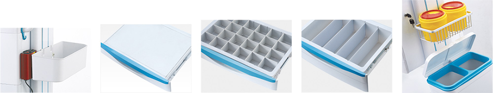 车体右侧配有摆放锐器盒网篮,下方有脚踩式带盖大污物桶,避免接触感染;