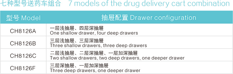 可增配置:伸缩式副工作台、36孔药盘、脚踩式垃圾桶、储物盒、利器盒组、除颤平台。
